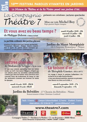 | Depuis 10 ans, la Maison du Théâtre et de la Poésie prend ses jardins d'été … cet été 2018 marquera le 10 ème Festival « Paroles Vivantes en Jardins »